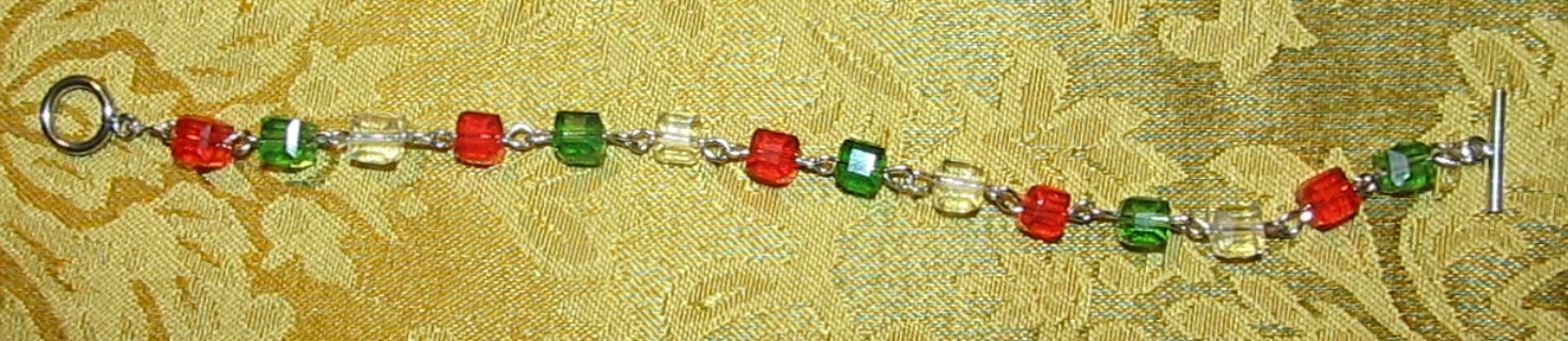Available in both sterling silver and craft wire, the Christmas Cube Bracelet features sparkling clear, red, and green beads with sterling silver toggle and t-bar clasp. Sterling silver measures 9.5 inches, craft wire measures 8.5 inches.