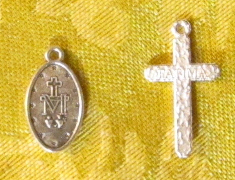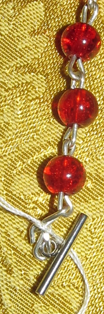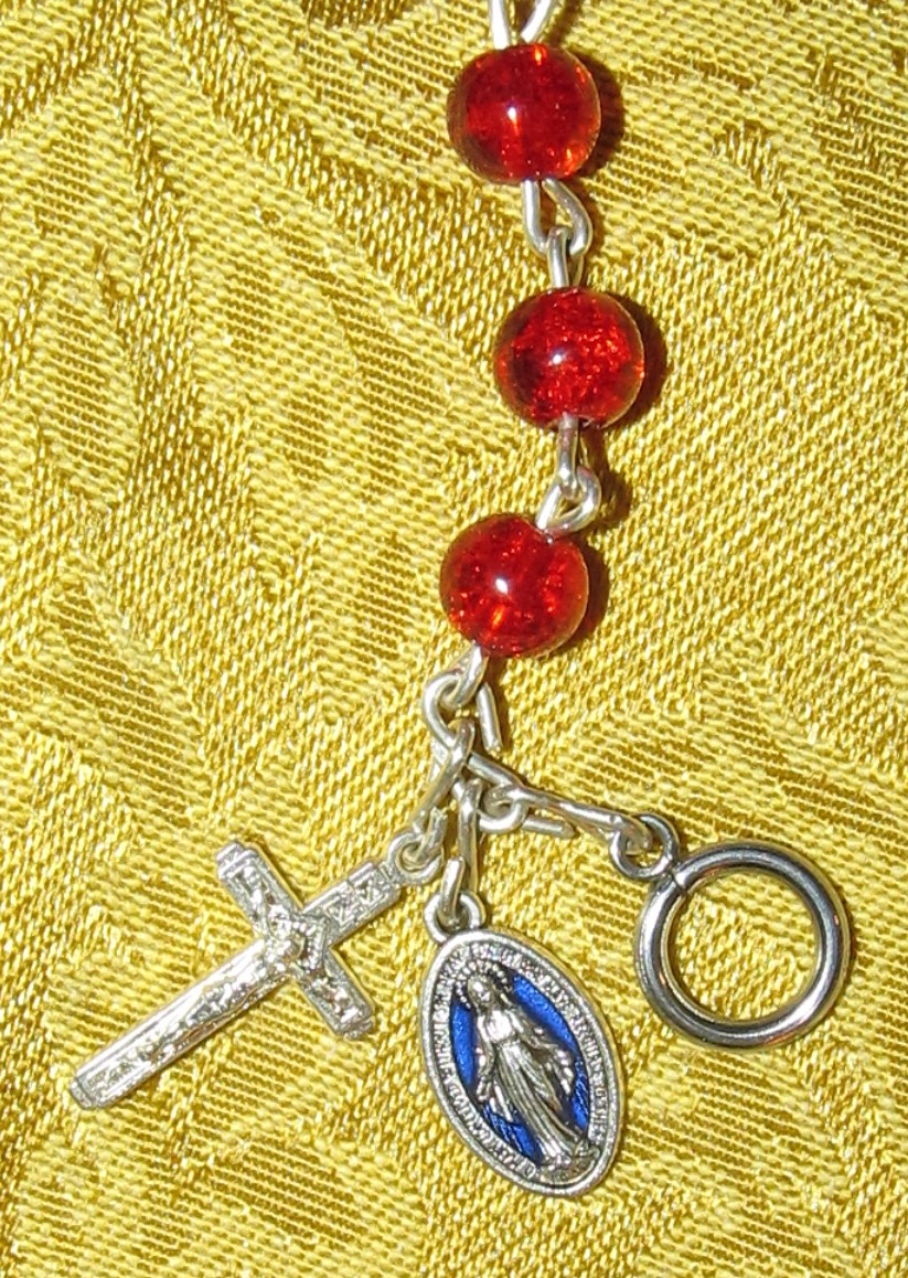 Details: 18ga full round 925 sterling silver wire, 8mm cracked red glass beads, petite sterling Fatima crucifix, enameled Miraculous Medal, stainless steel toggle/t-bar clasp.